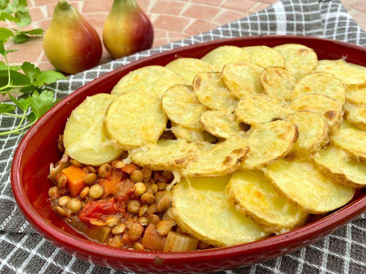 Lentil and Vegetable Hot Pot with Sliced Potatoes and Seasonal Vegetables